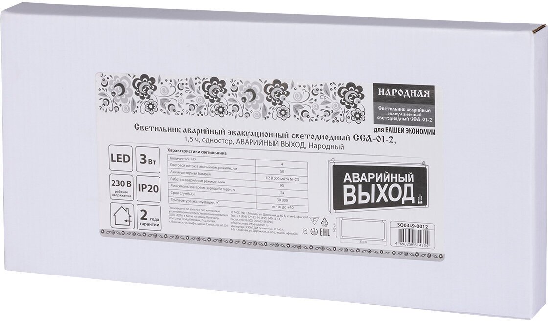 Светильник аварийный эвакуационный светодиодный ССА-01-2, 1,5 ч, одностор, аварийный выход, Народный информация: