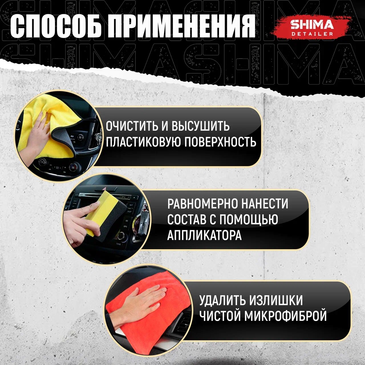 | Способ применения | 1. Нанести небольшое количество состава на предварительно очищенную и высушенную поверхность, равномерно распределить с помощью поролонового аппликатора. 2. При необходимости удалить излишки состава микрофиброй. Для сильно поврежденных поверхностей (или при сильно пересушенном пластике) рекомендуется повторное нанесение. |
