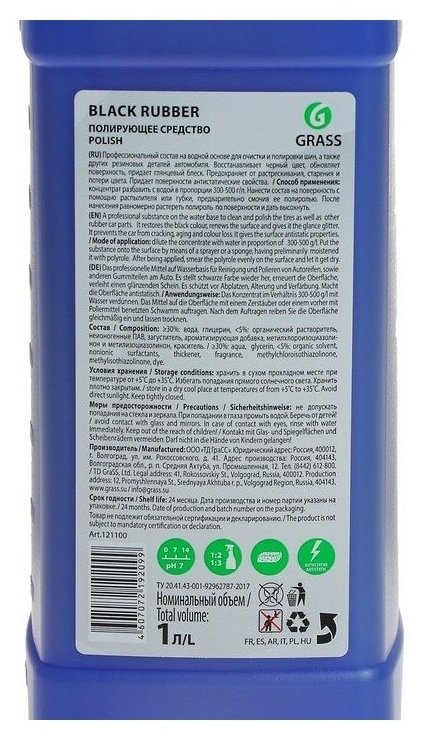 | Дополнительная информация | Профессиональный состав на водной основе для очистки и полировки шин, а также других резиновых деталей автомобиля. Восстанавливает черный цвет, обновляет поверхность, придает глянцевый блеск. Предохраняет от растрескивания, старения и потери цвета. Придает поверхности антистатические свойства. |