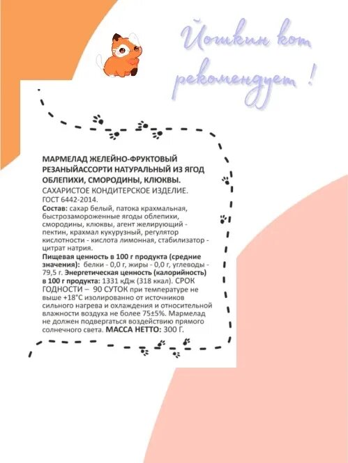 Мармелад Йошкин Кот Желейно-Фруктовый резаный Ассорти натуральный из ягод Облепихи, Смородины, Клюквы информация: