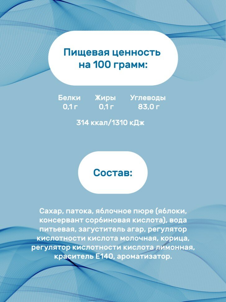 | Состав | сахар, патока, морошка, вода питьевая, загуститель агар Е406, регулятор кислотности: кислота лимонная, кислота молочная |
