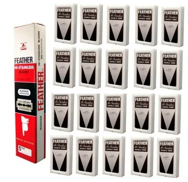 Двусторонние японские лезвия FEATHER чёрная упаковка "Hi-Stainless" для T-образных бритв и шаветок, упаковка 5 шт