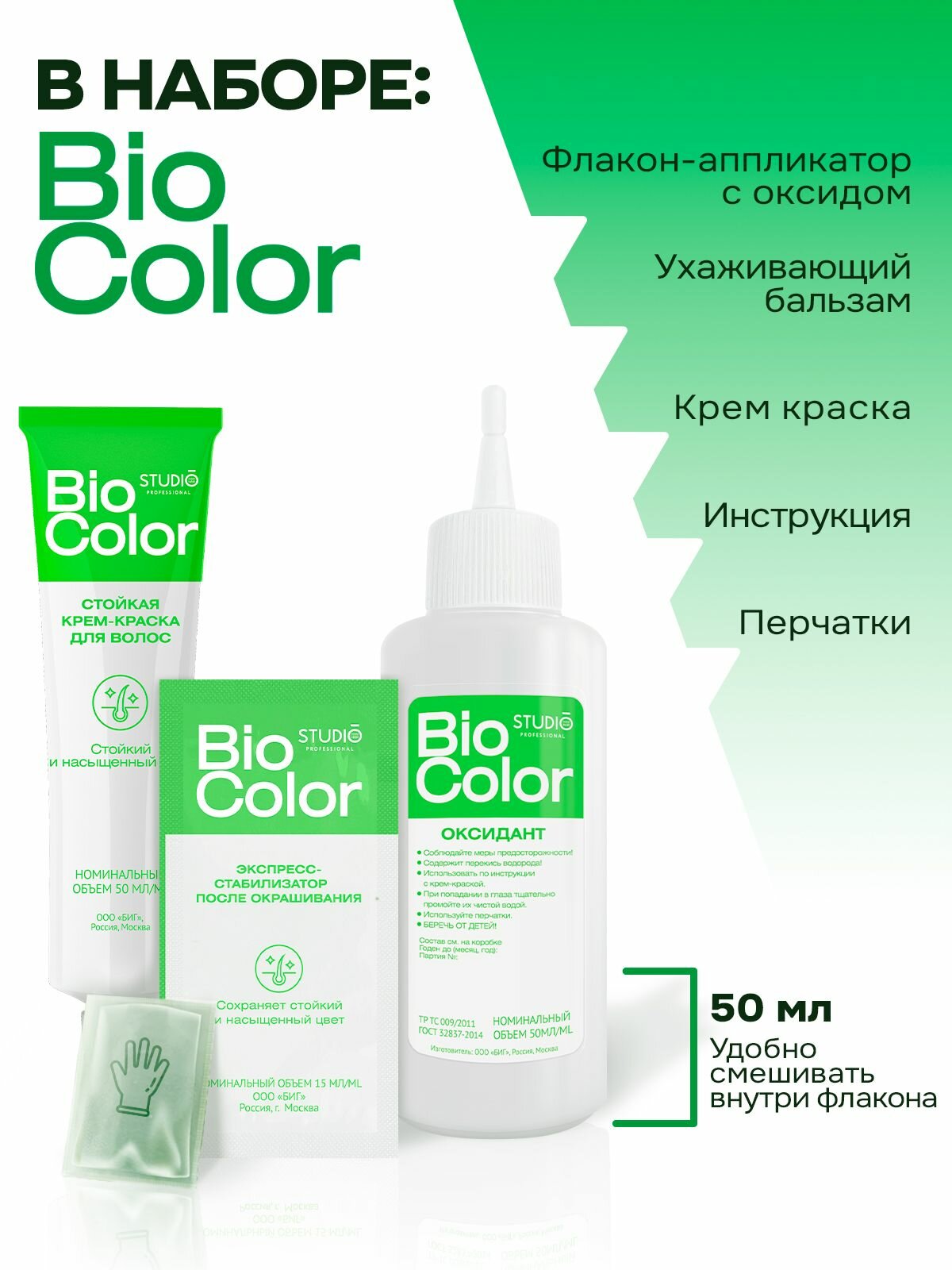 | Комплектация | туба с крем-краской - 50мл, флакон-аппликатор с оксидантом - 50мл, пакетик с бальзамом-закрепителем для окрашенных волос - 15мл; пара перчаток, инструкция по применению |