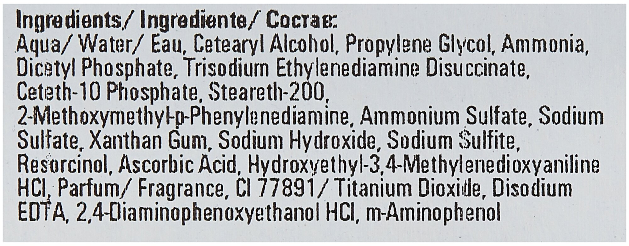 | Состав | aqua/ water/ eau, cetearyl alcohol, propylene glycol, ammonia, dicetyl phosphate, trisodium ethylenediamine disuccinate, ceteth-10 phosphate, steareth-200, ammonium sulfate, sodium sulfate, xanthan gum, sodium hydroxide, sodium sulfite, ascorbic acid, parfum/ fragrance, 2-methoxymethyl-p-phenylenediamine, ci 77891/ titanium dioxide, disodium edta, resorcinol, 2,4-diaminophenoxyethanol hcl |