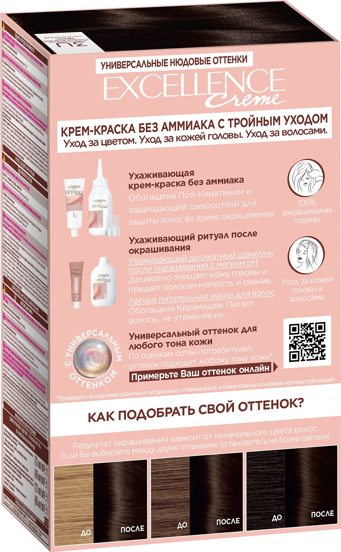 Крем-краска для волос L'oreal Excellence Creme Nudes, тон: 3U Универсальный темно-каштановый, 192 мл