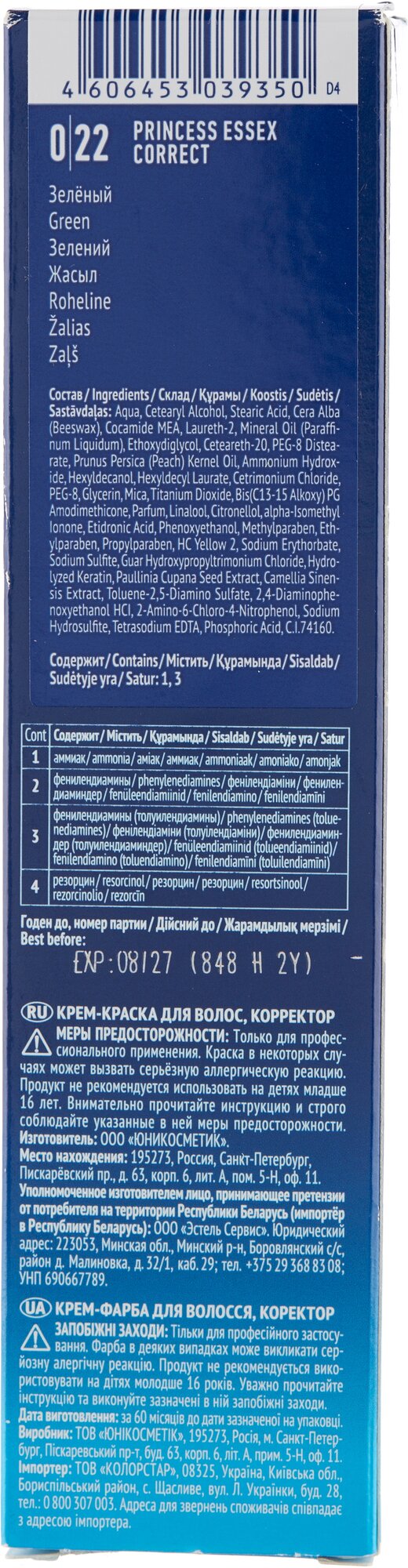 Отзывы на Крем-краска PRINCESS ESSEX CORRECT для окрашивания волос ESTEL PROFESSIONAL 0/22 зеленый 60 мл