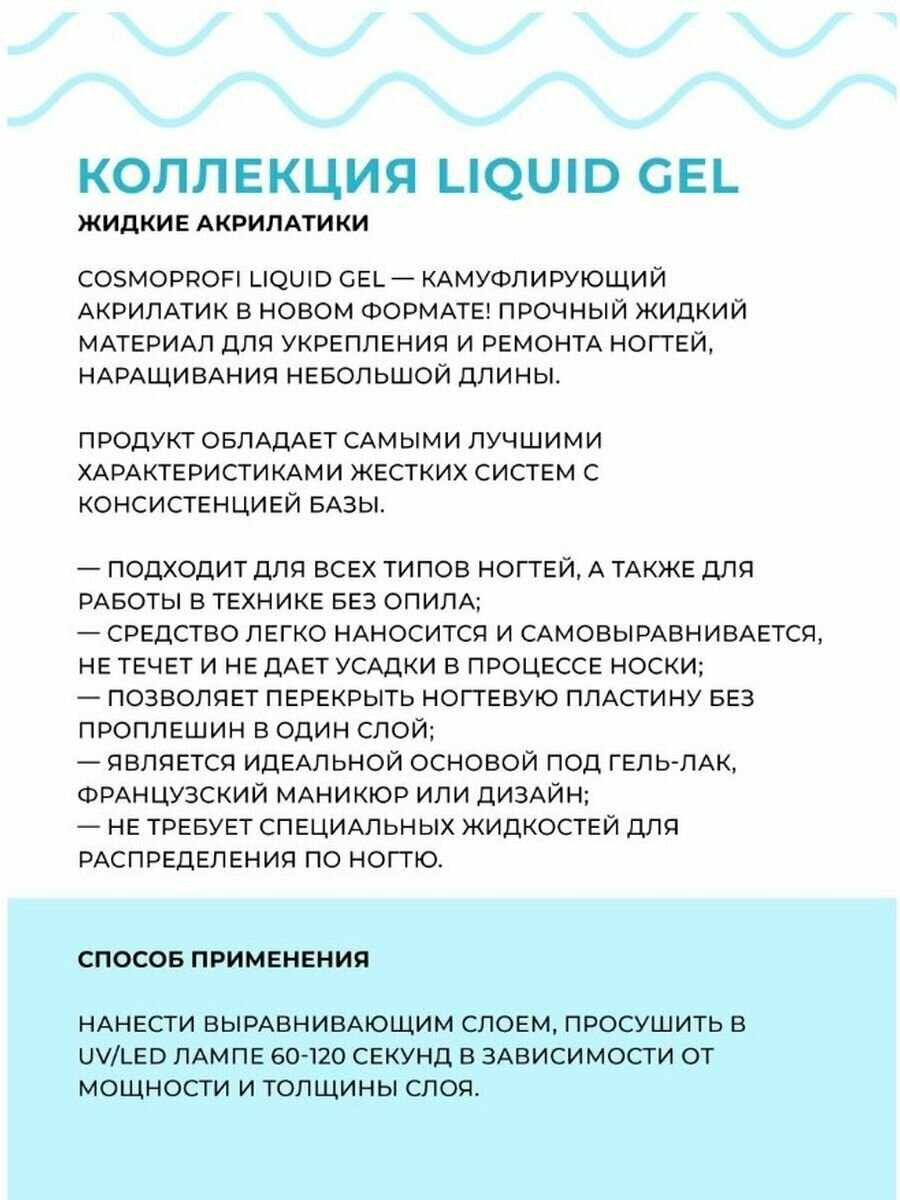 | Способ применения | Способ применения: нанести выравнивающим слоем, просушить в UV/LED лампе 60-120 секунд в зависимости от мощности и толщины слоя. *Рекомендуем для лучшей сцепки наносить жидкий акрилатик на подложку из прозрачной базы. |