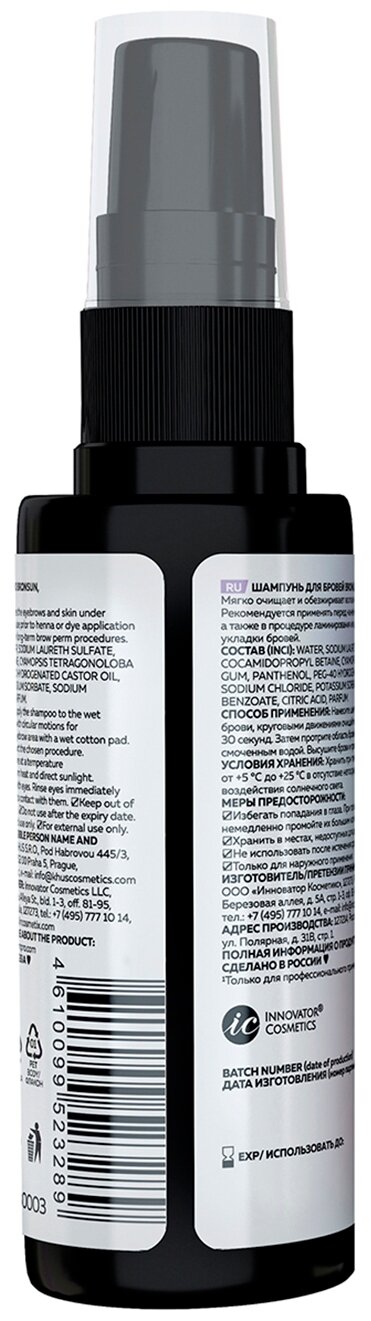| Способ применения | Нанесите шампунь на влажные брови. Круговыми движениями очищайте их в течение 30 секунд. Затем протрите область бровей ватным диском, смоченным водой. Высушите брови и приступайте к процедуре. |