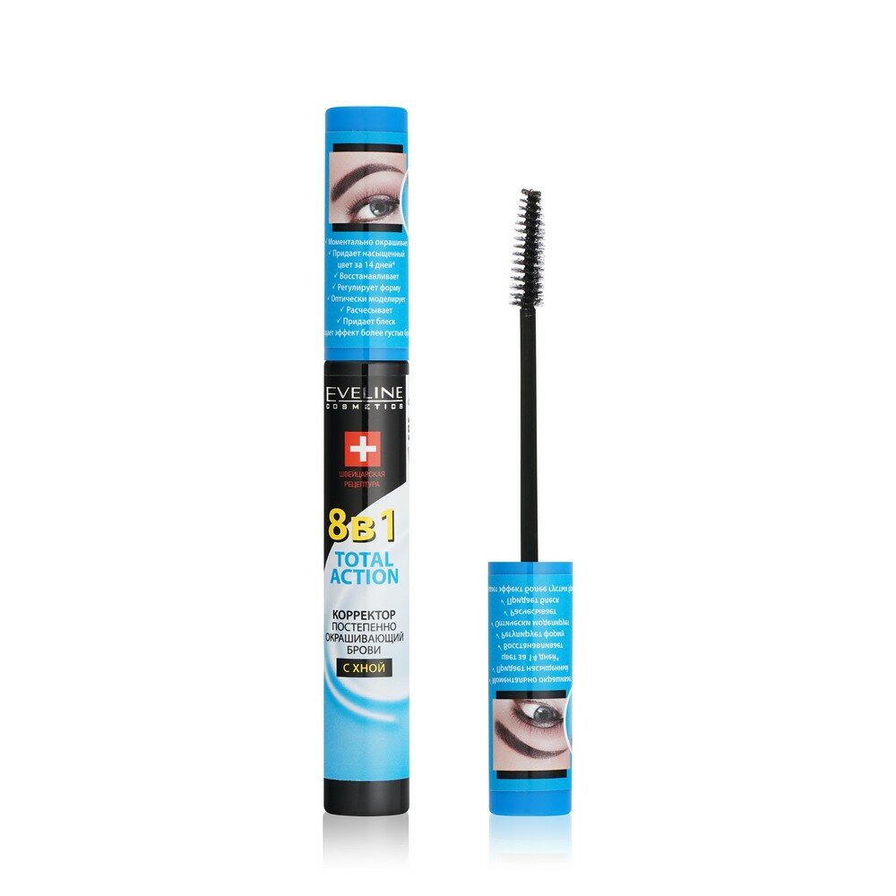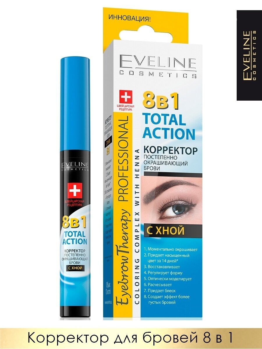 10 цен на EVELINE Корректор для бровей 8в1 TOTAL ACTION постепенно окрашивающий брови, с хной, 10 мл