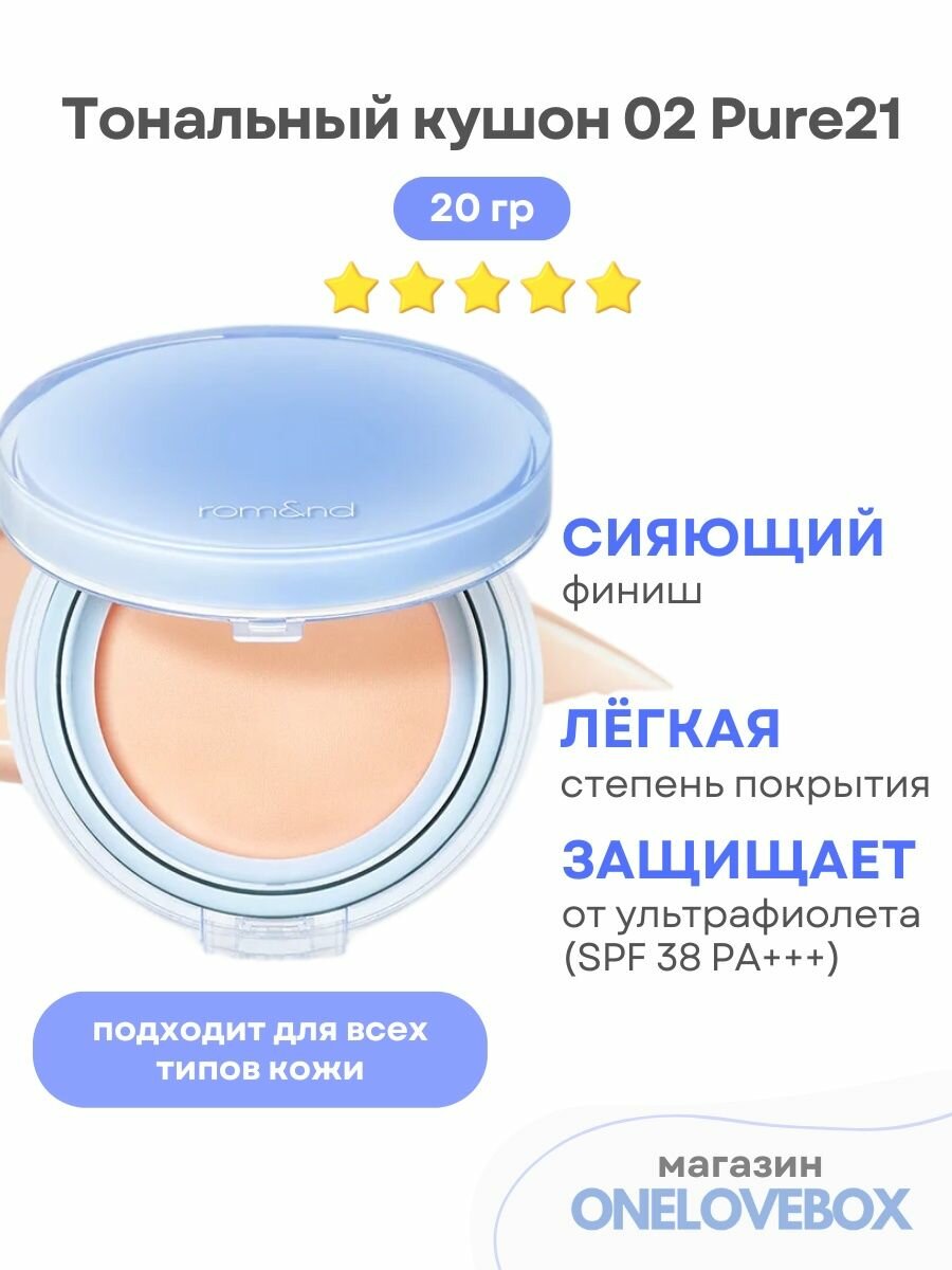 Тональный увлажняющий кушон для лица ROM&ND 02 pure 21 Bare Water Cushion SPF 38 PA++ 2 038 ₽