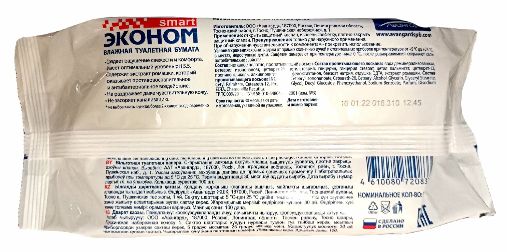 Влажная туалетная бумага Эконом smart № 100 Деликатный уход 100 листов, 1 упак информация: