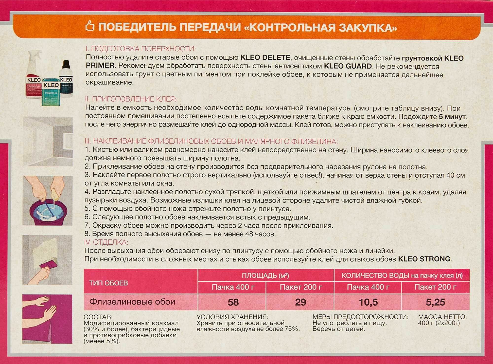 Клей для флизелиновых обоев Kleo 0.4 кг 58 м информация: