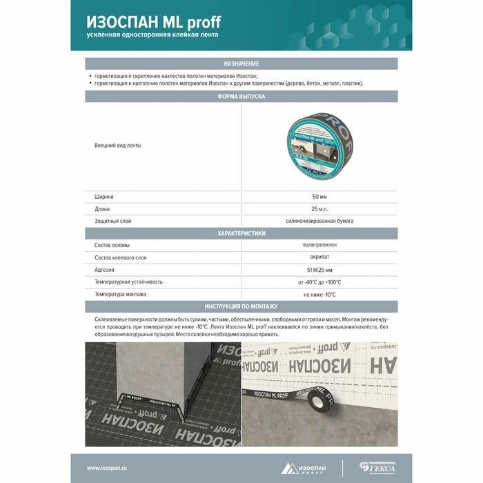 Отзывы на Лента клейкая усиленная односторонняя Изоспан ML proff, ширина 50мм. длина 25 м.п, для герметизация и скрепление нахлестов полотен