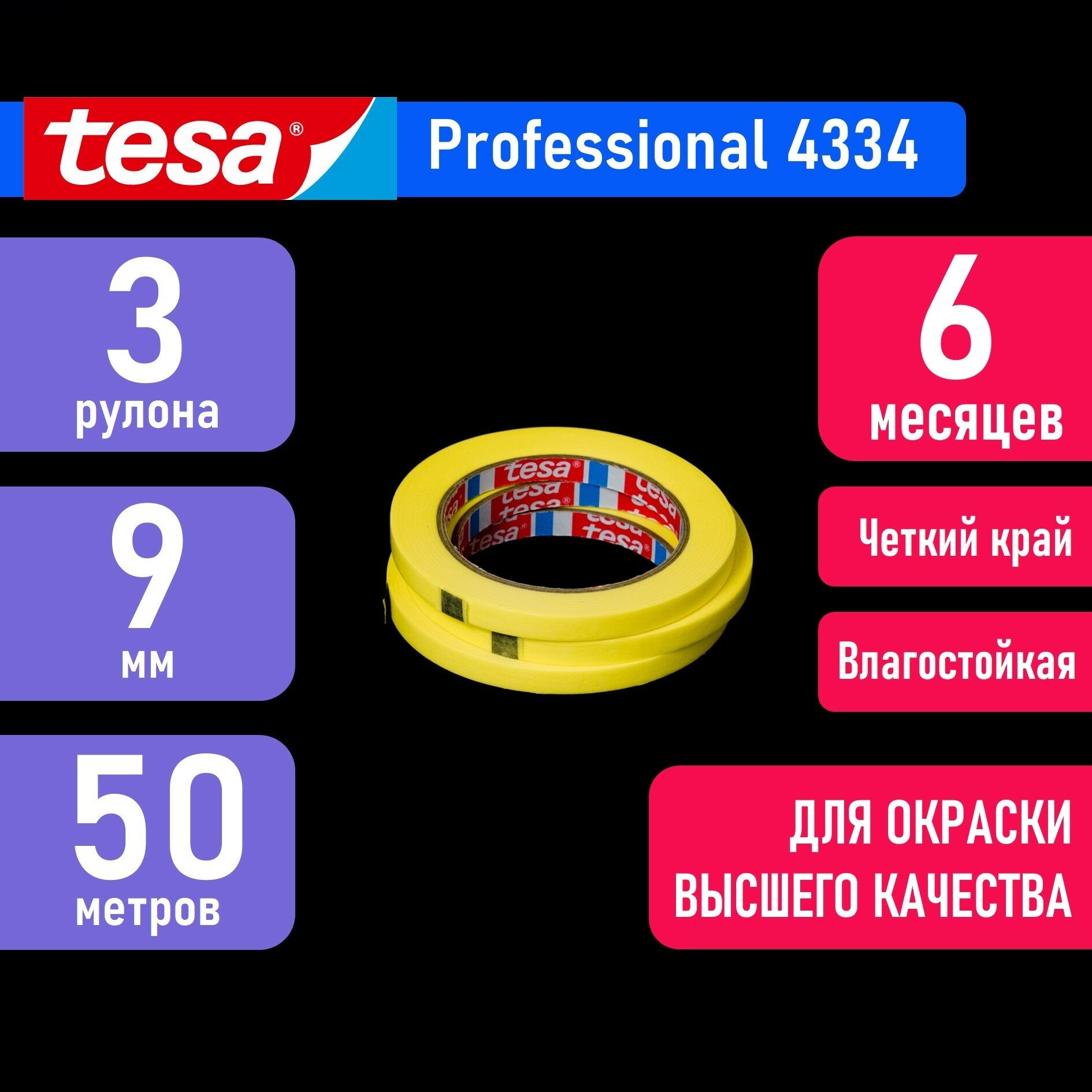 10 цен на Малярная лента TESA желтая для четких краев, TESA 4334 четкий край, 9 мм х 50 метров (6 месяцев), оригинал - 3 шт