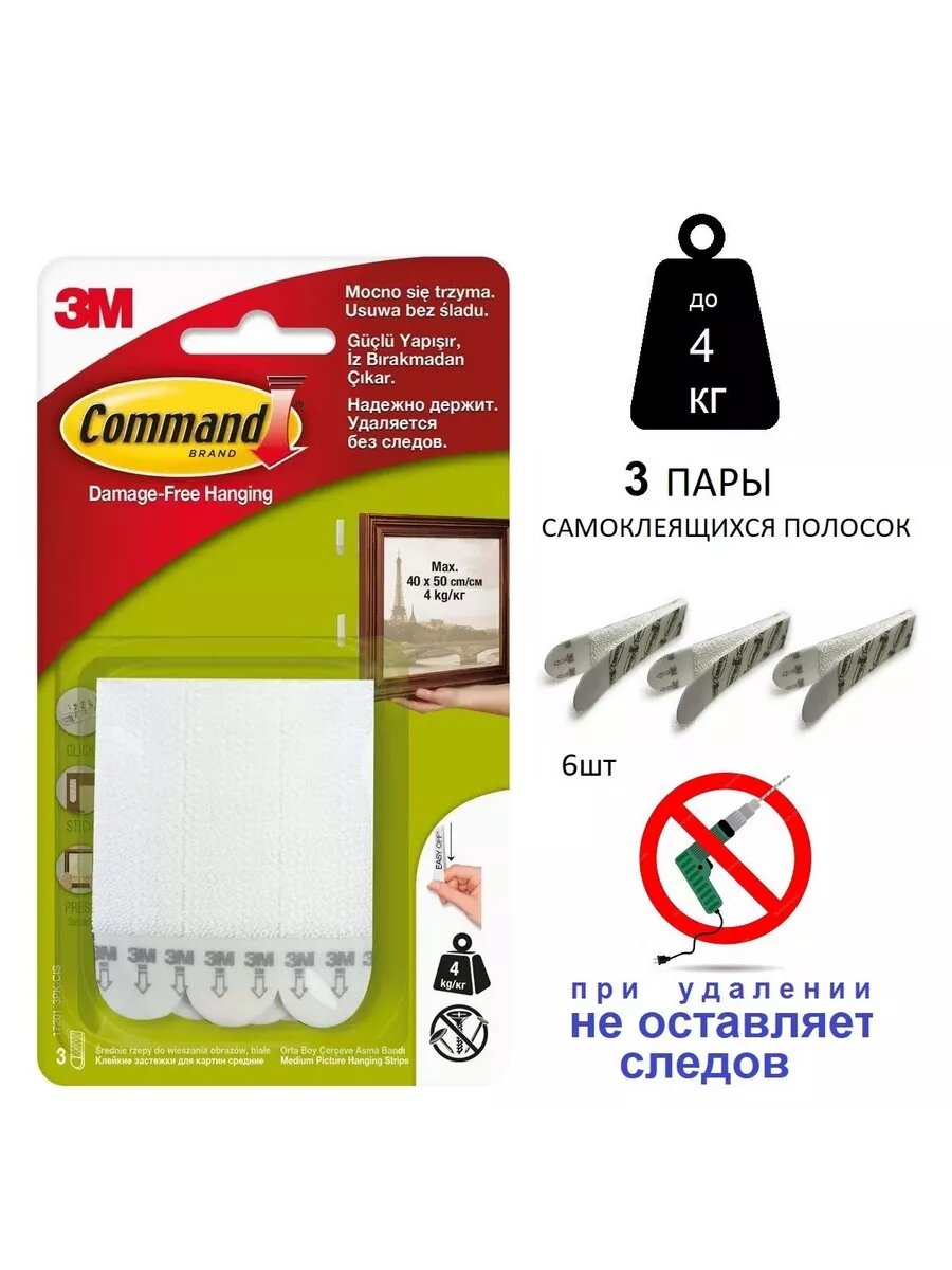 Застежки для картин Command самоклеящиеся (17201ЗРК) 3 пары/уп, 1 уп информация: