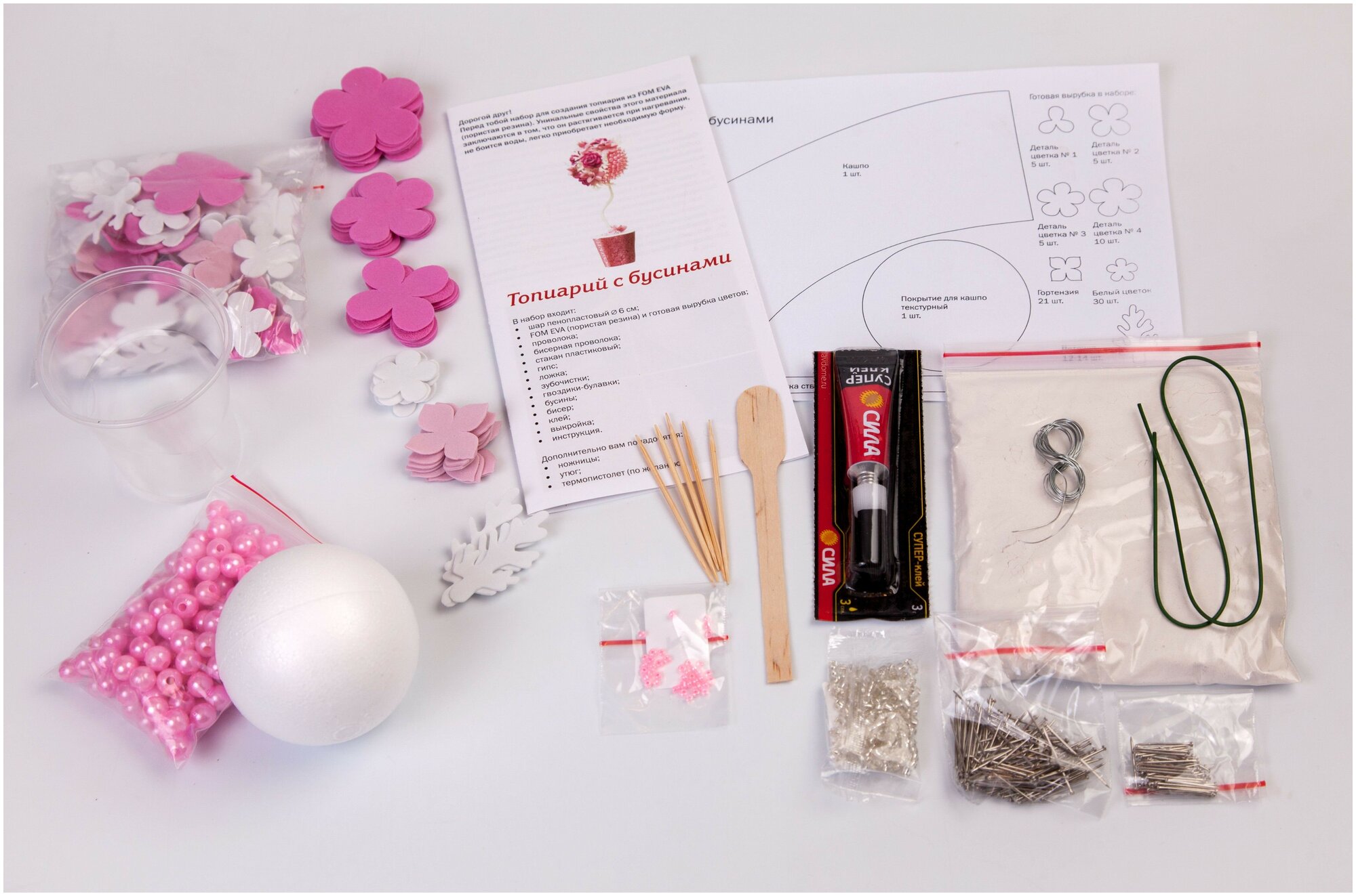 | Комплектация | Шар пенопластовый 6 см, Листы и готовая вырубка из FOM EVA, Клей, Зубочистки, Гвоздики-булавки, Атласная лента, Проволока, Стакан, Гипс |