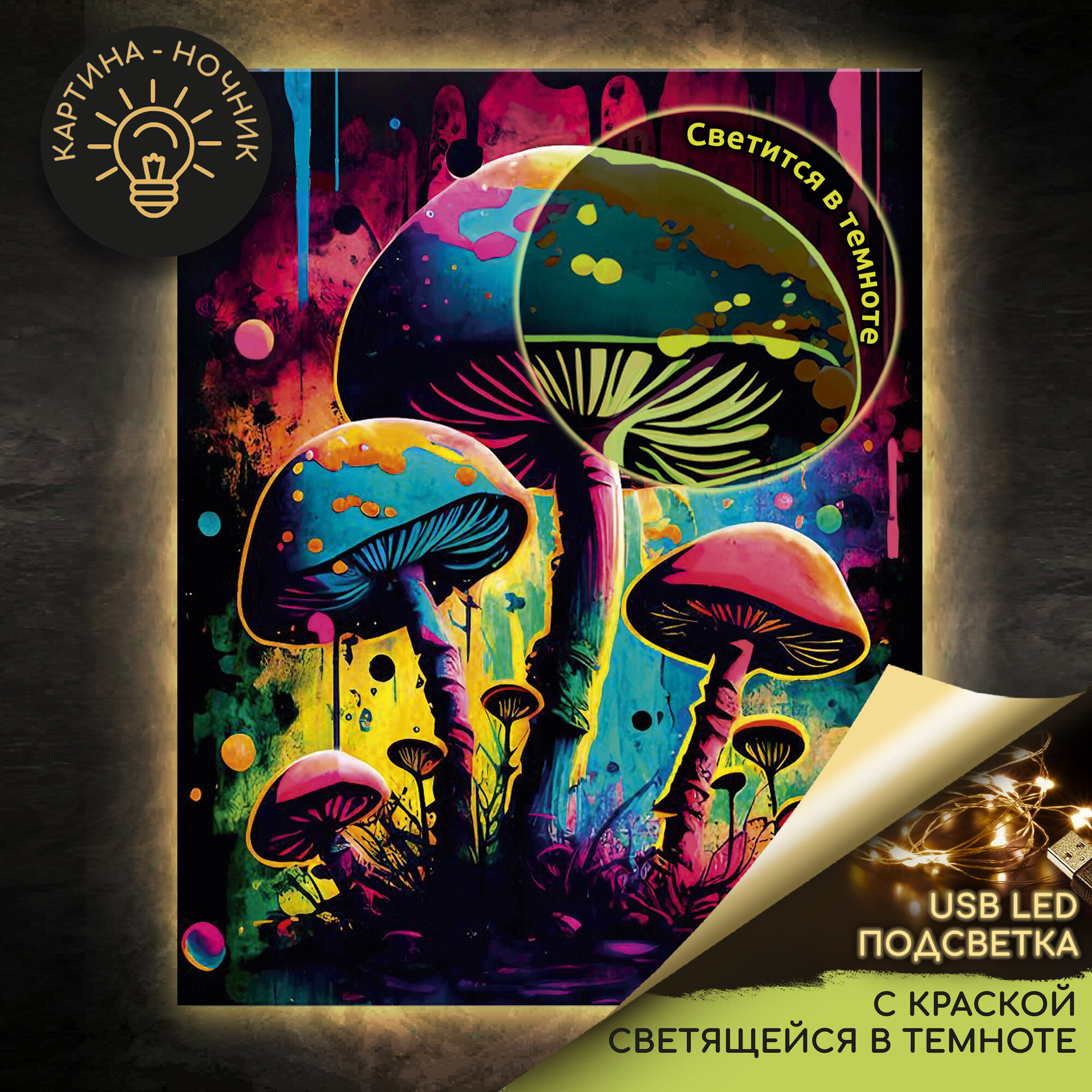 Картина по номерам с LED подсветкой и светящейся краской (40х50) неоновые грибы (18 цветов) информация: