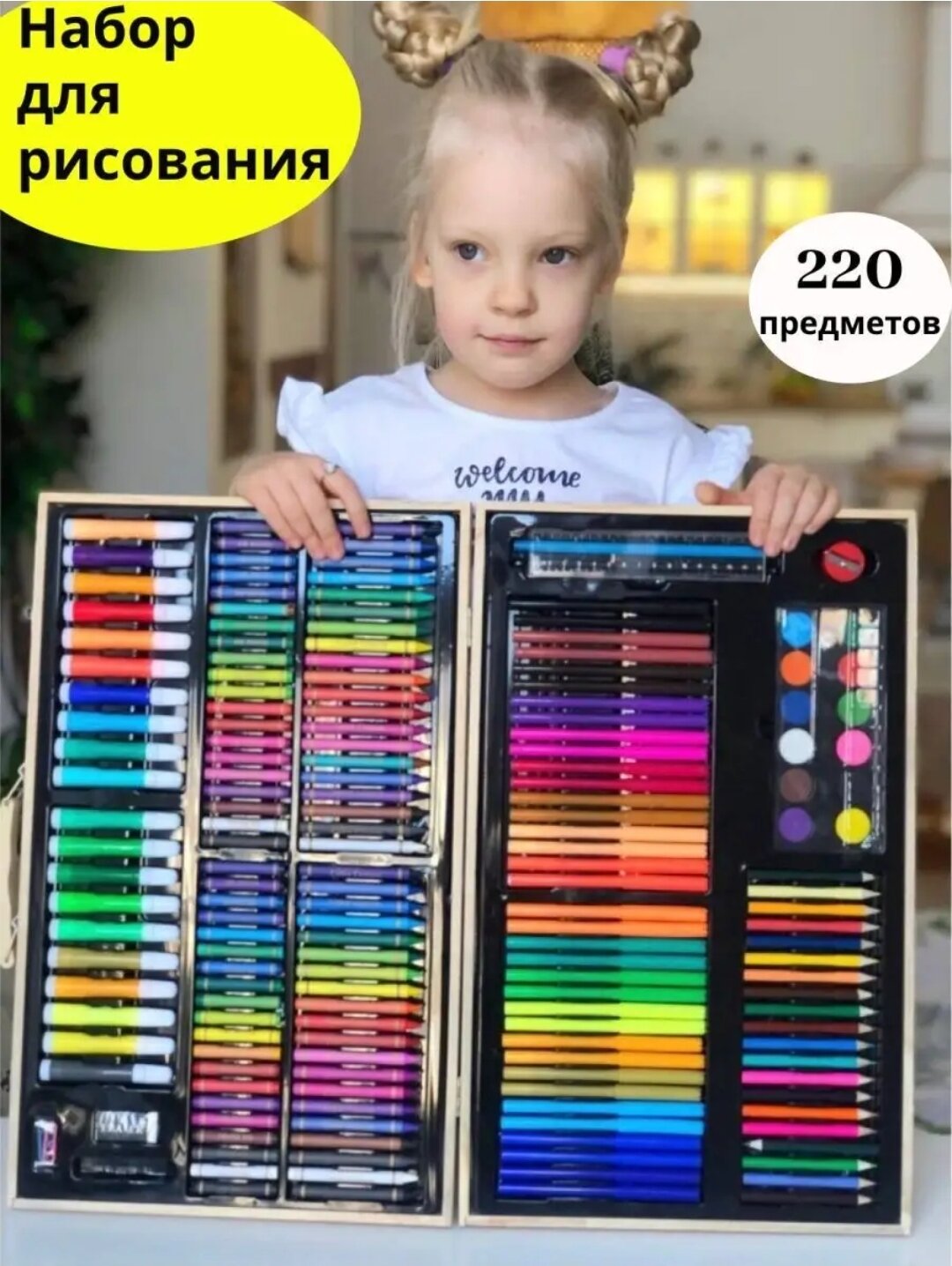 Набор для рисования и творчества 220 предметов в деревянном чемоданчике информация: