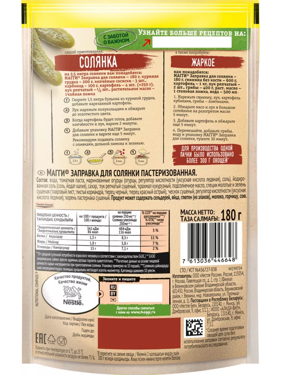 | Способ приготовления | На 2,5 л солянки вам понадобится: МАГГИ® Заправка для солянки - 180 г / куриная грудка - 200 г / копченые сосиски - 3 шт. / карбонад - 100 г / картофель - 4 шт. (~ 250 г) / лук репчатый - 1/2 шт. / растительное масло - 1 ч. ложка. 1. Сварите 1,5 л бульона из куриной грудки / добавьте нарезанный картофель. 2. Лук нарежьте полукольцами и обжарьте до золотистого цвета. 3. Когда картофель будет готов / добавьте копчености и лук / варите 2 мин. 4. Добавьте Заправку MAGGI® для солянки и варите еще 5 мин. Рекомендуем подавать солянку с оливками / долькой лимона и зеленью. |