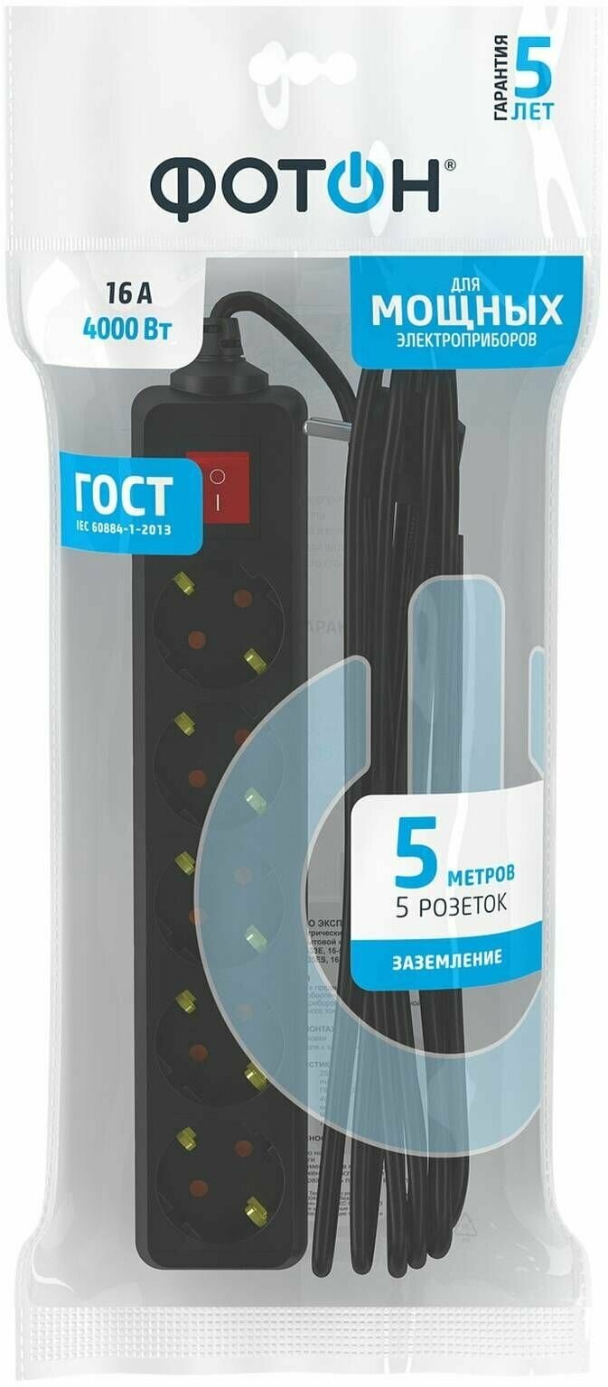 Фотон Удлинитель сетевой 16-55ЕS, 5м, 5 розеток, 16А, с выкл., с заземл., Черный 22731 информация: