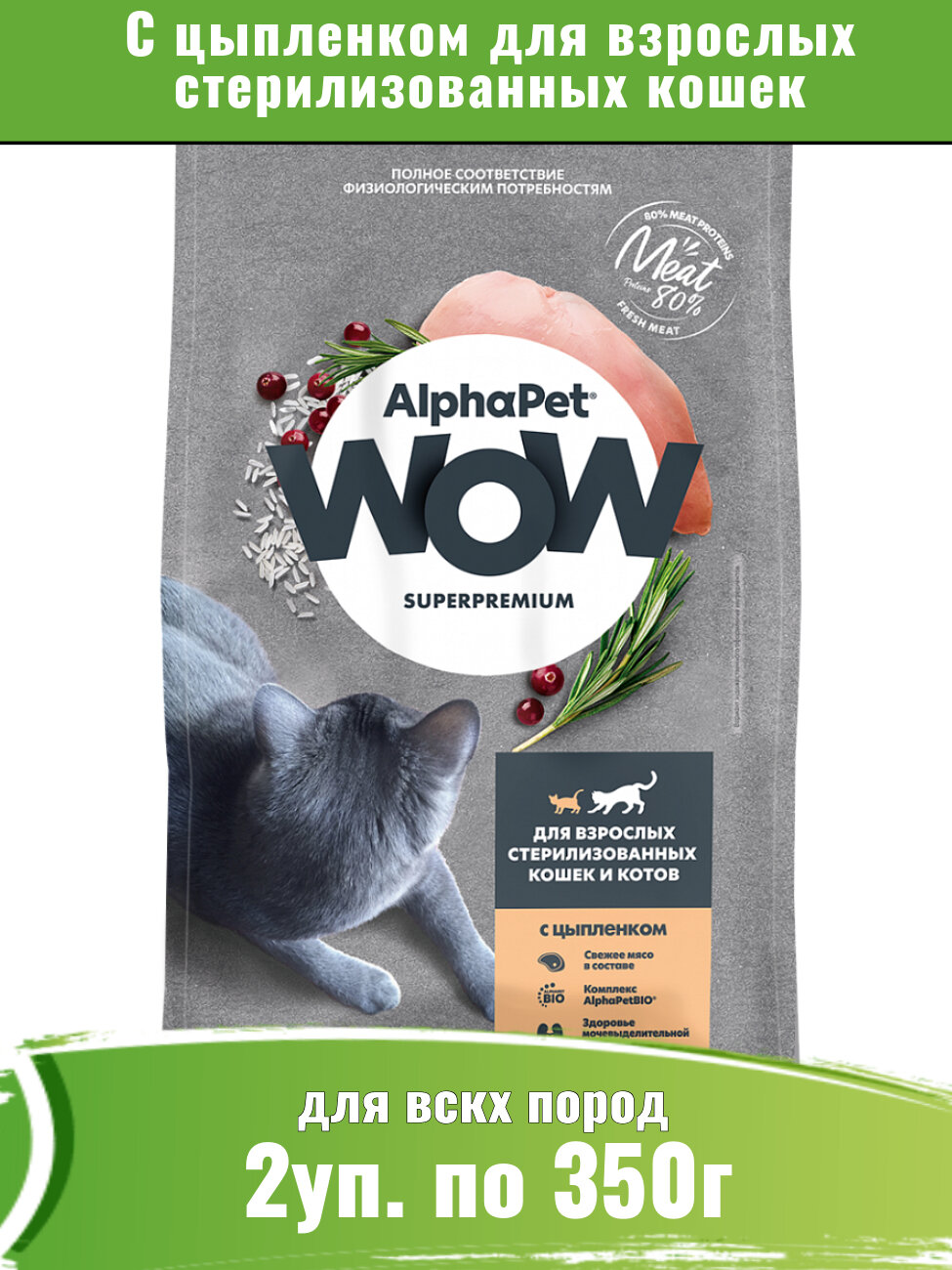 AlphaPet WOW корм сухой для взрослых стерилизованных кошек c цыпленком 2уп по 350г 857 ₽
