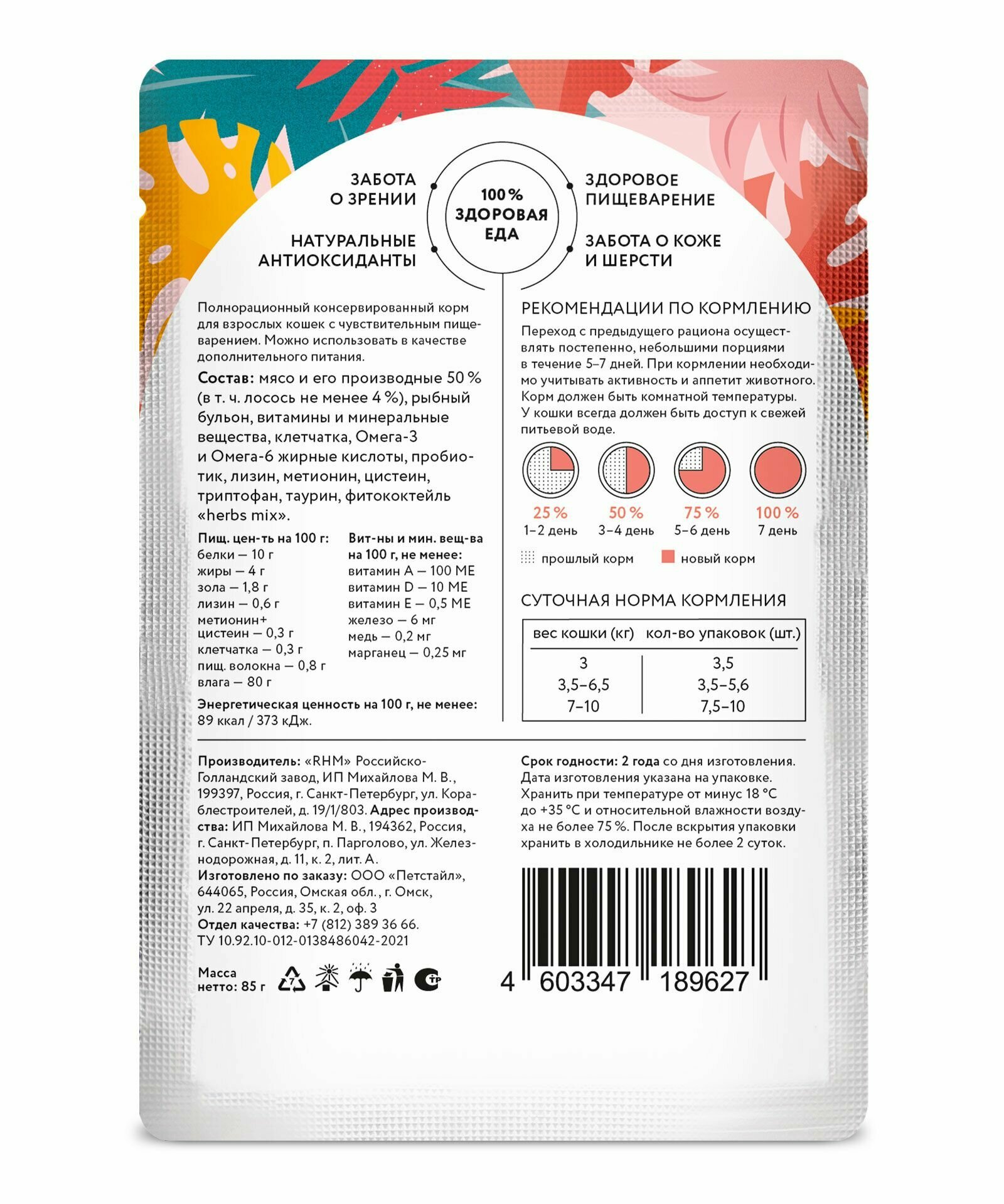 | Дополнительная информация | Переход с предыдущего рациона осуществлять постепенно, небольшими порциями в течение 5-7 дней. При кормлении необходимо учитывать активность и аппетит животного. Корм должен быть комнатной температуры. Содержимое открытой упаковки хранить при температуре +5°С и использовать в течение 2 дней. У кошки всегда должен быть доступ к свежей питьевой воде. |