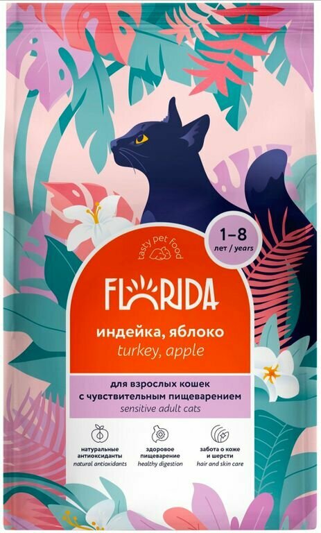Сухой корм для кошек с чувствительным пищеварением Florida индейка, яблоко, 4 кг информация: