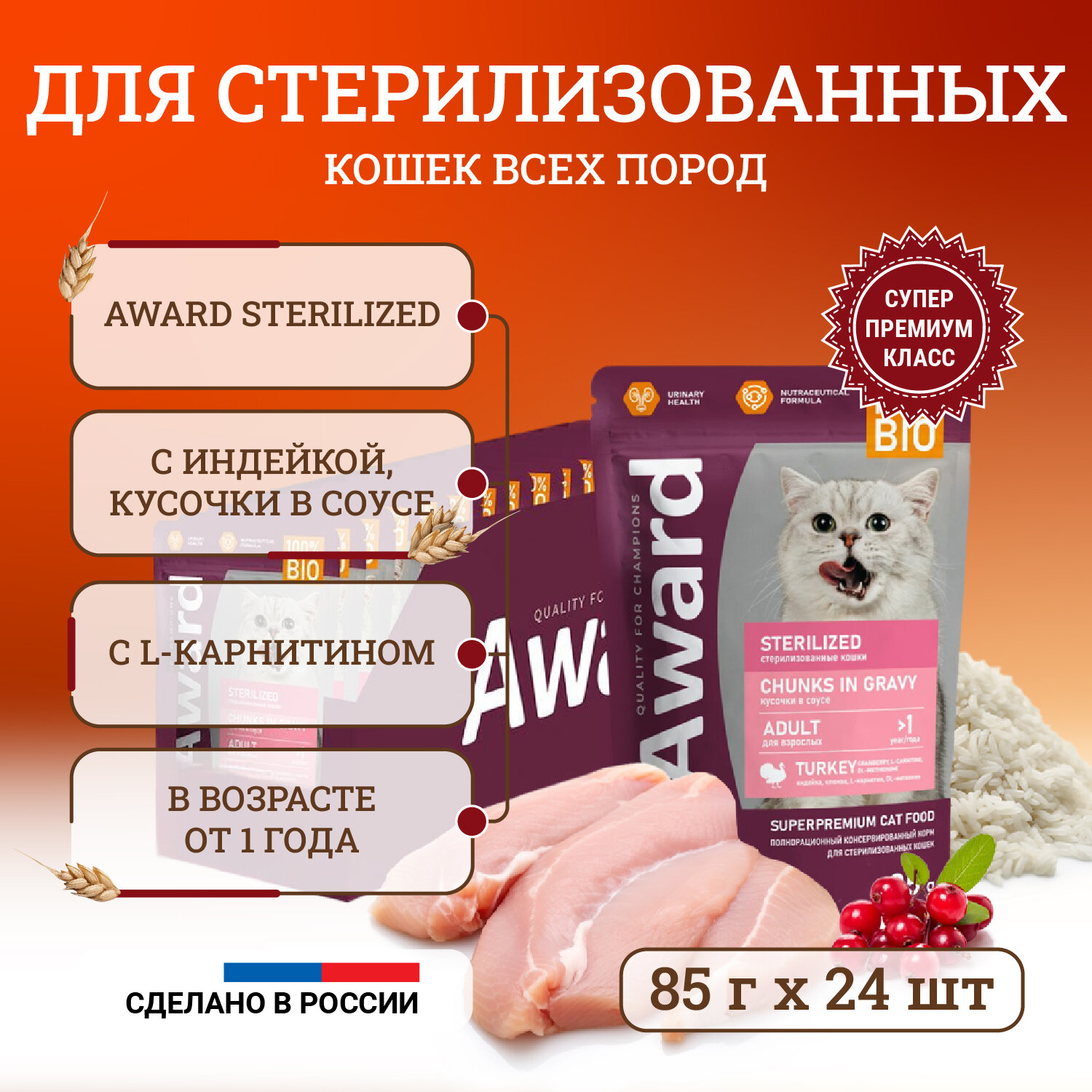 10 цен на AWARD STERILIZED TURKEY для взр кастр котов и стерилиз кошек с индейкой в соусе пауч 85 гр 85 гр х 24 шт
