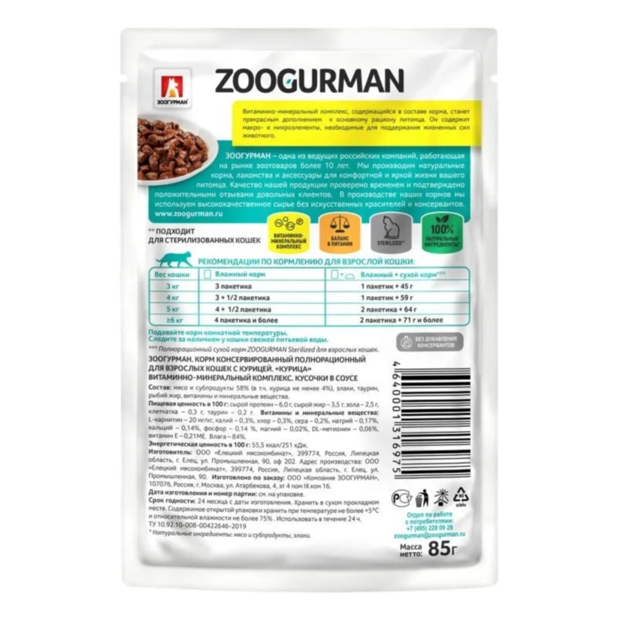 Влажный корм zoogurman для стерилизованных кошек курица кусочки в соусе 85г 6975 информация: