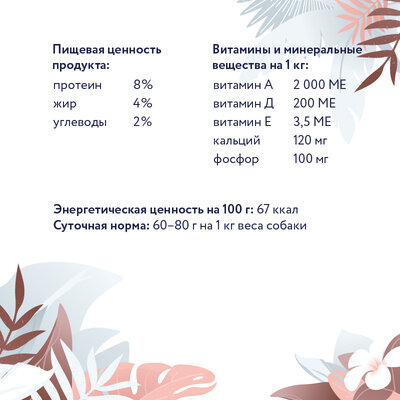 | Дозировка | Рекомендации по кормлению: 60-80г на 1кг веса собаки. Суточная норма может варьироваться в зависимости от возраста, комплекции и уровня активности вашего питомца. Не забывайте своевременно пополнять миску свежей питьевой водой. Возможно смешанное кормление (сухой + влажный корм) |