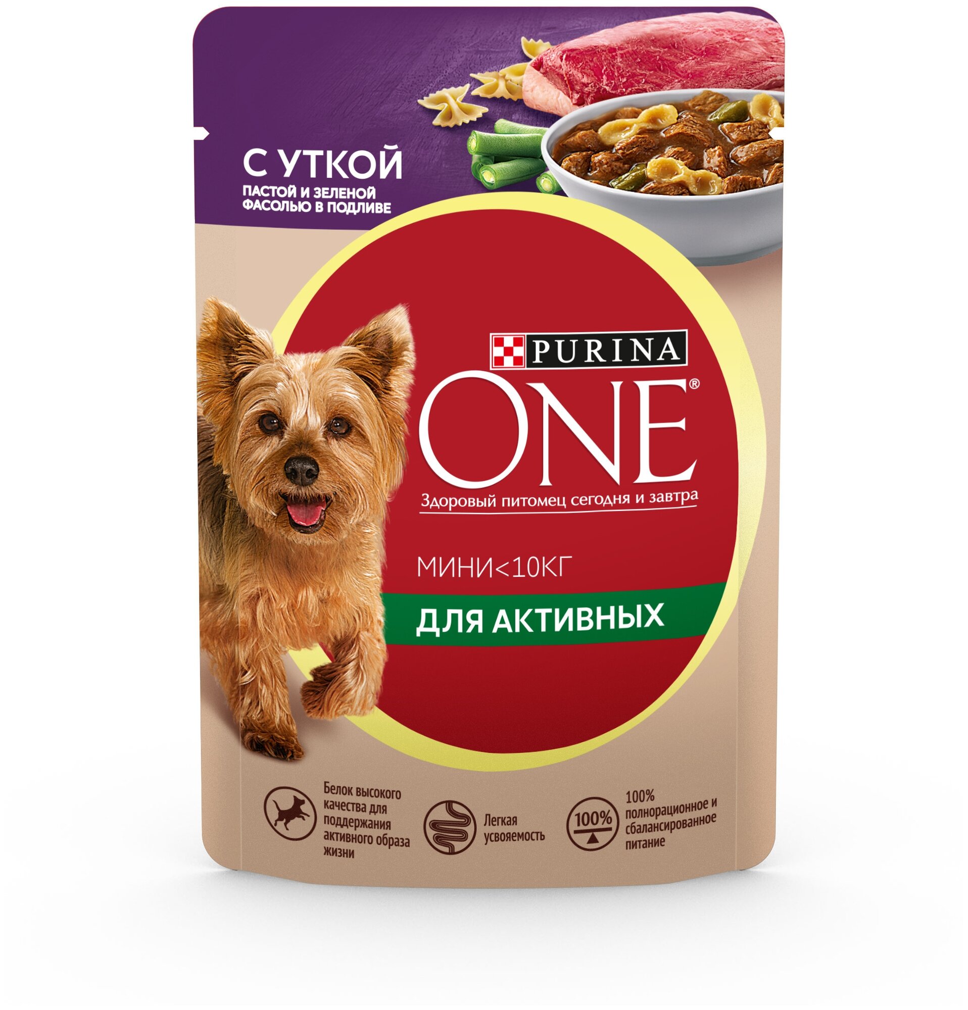 Purina ONE Мини 85 г пауч влажный корм для активных собак с уткой, пастой и зеленой фасолью в подливе х26 штук информация: