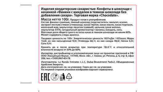 | Состав | финики сушеные, темный шоколад (подсластитель: мальтит, ксилит, экстракт листьев стевии (стевиозид); какао тертое, какао масло, какао порошок, молочный жир, эмульгатор: лецитин (соевый), цельное сухое молоко, эмульгатор: Е476, натуральный ароматизатор - ваниль), миндаль, соль. Массовая доля общего сухого остатка какао в темном шоколаде не менее 60%. Может содержать следы арахиса. |