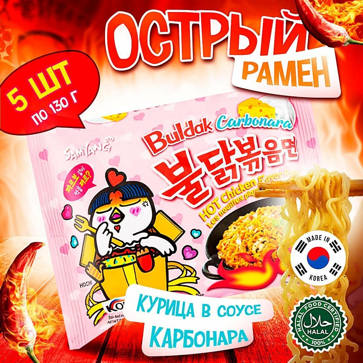 Лапша быстрого приготовления Hot Chicken острая курица в соусе карбонара Samyang, пачка 130 г х 5 шт информация: