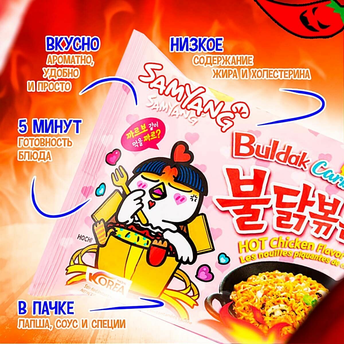 Отзывы на Лапша быстрого приготовления Hot Chicken острая курица в соусе карбонара Samyang, пачка 130 г х 5 шт