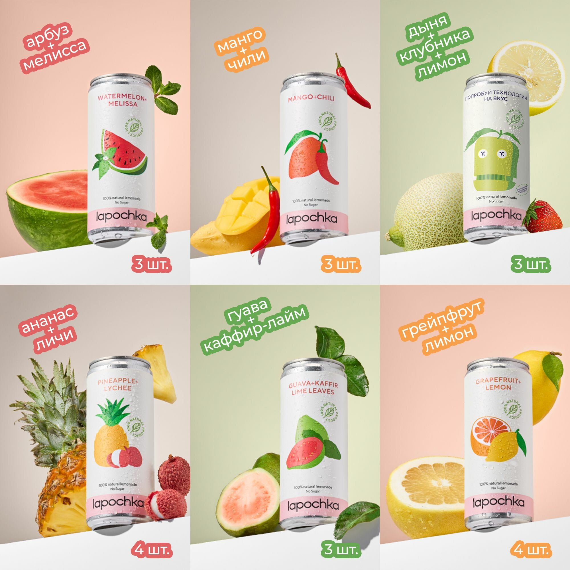 Натуральный лимонад без сахара LAPOCHKA x техпросвет Дыня + Клубника + Лимон 20 x 0,33 л 2 782 ₽