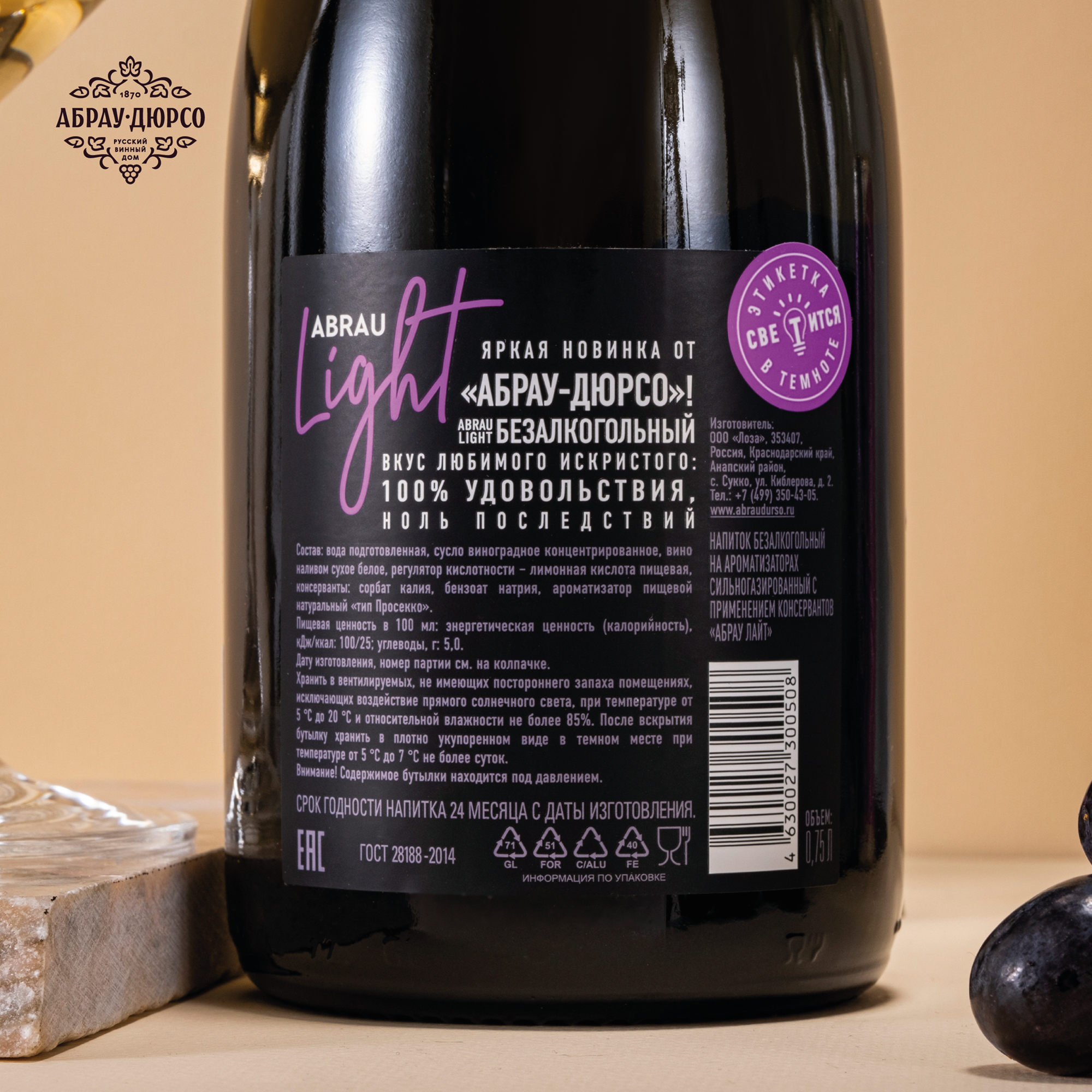 Напиток винный безалкогольный сильногазированный ароматизированный "ABRAU Light" Абрау Лайт информация: