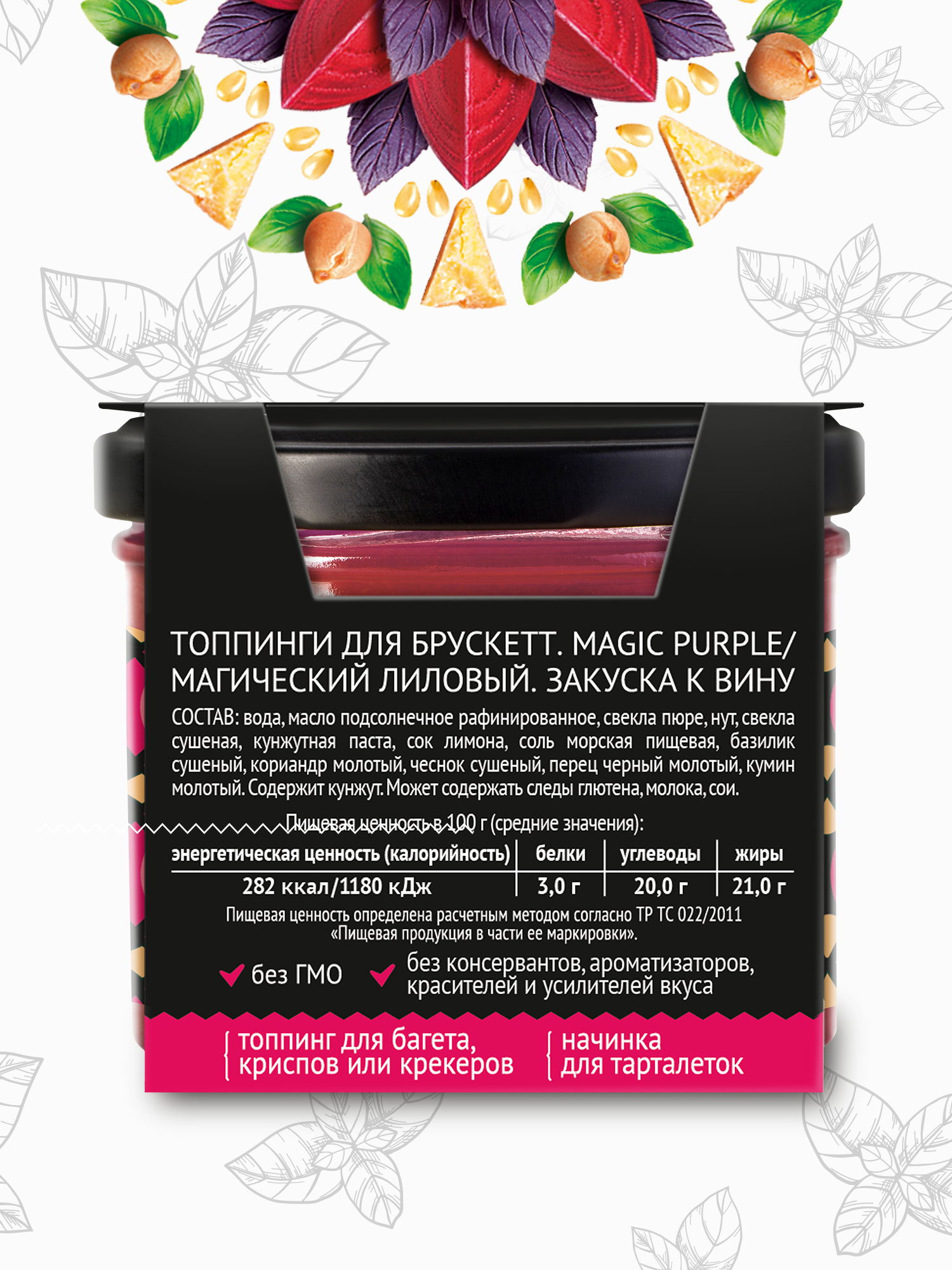 | Состав | вода, масло подсолнечное рафинированное, свекла пюре, нут, свекла сушеная, кунжутная паста, сок лимона, соль морская пищевая, базилик сушеный, кориандр молотый, чеснок сушеный, перец черный молотый, кумин молотый. Содержит кунжут. Может содержать следы глютена, молока, сои. |