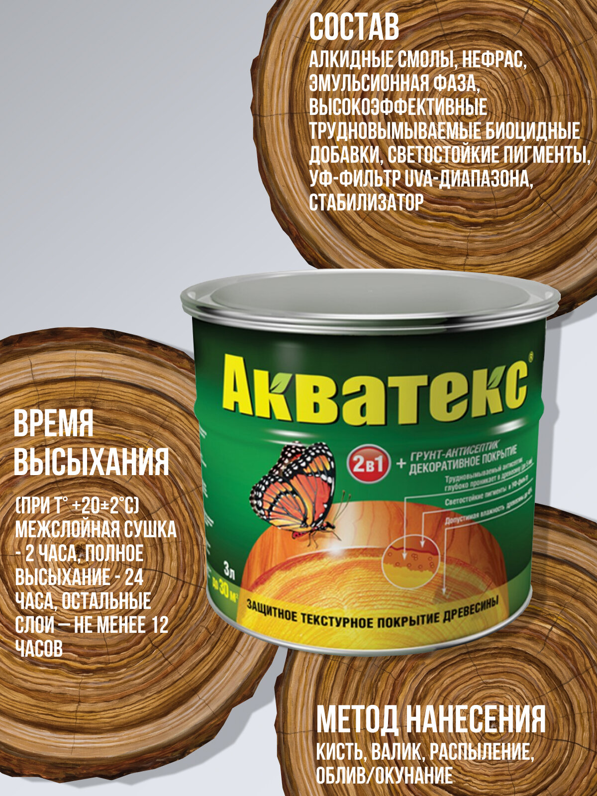 | Дополнительная информация | емпература применения: от +5°С, относительная влажность воздуха менее 80%; межслойная сушка - 2 часа; расход в 1 слой: для строганой древесины: 1л на 10-15м², для пиленой древесины: 1л на 5-7м²; допустимая влажность древесины до 40%; снаружи помещений состав наносить не менее, чем в 2 слоя, внутри помещений – в 1-2 слоя в зависимости от желаемого внешнего вида покрытия |