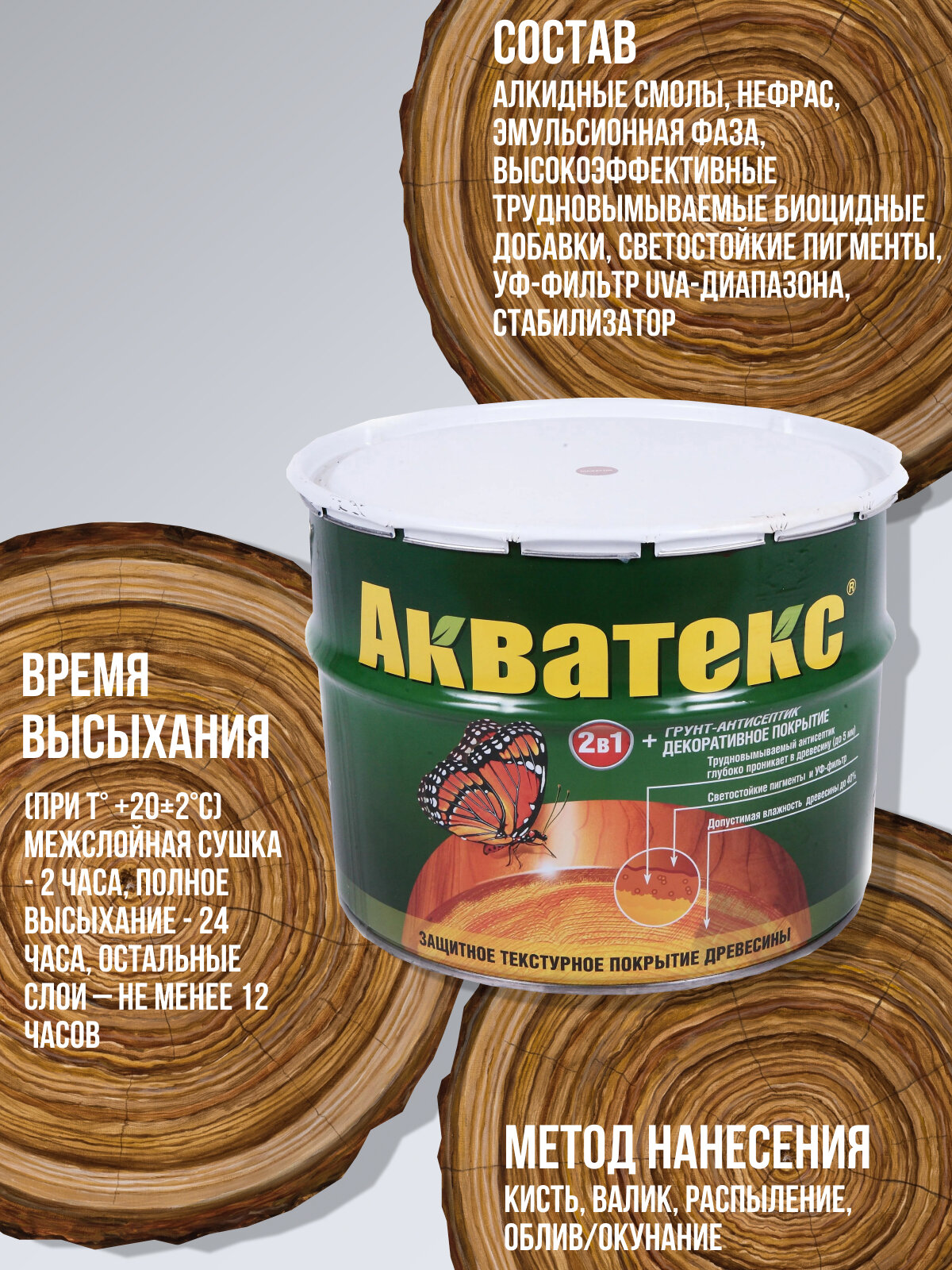 | Дополнительная информация | емпература применения: от +5°С, относительная влажность воздуха менее 80%; межслойная сушка - 2 часа; расход в 1 слой: для строганой древесины: 1л на 10-15м², для пиленой древесины: 1л на 5-7м²; допустимая влажность древесины до 40%; снаружи помещений состав наносить не менее, чем в 2 слоя, внутри помещений – в 1-2 слоя в зависимости от желаемого внешнего вида покрытия |