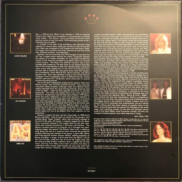 | Треклист | A1 Dancing Queen 3:49 A2 Knowing Me, Knowing You 4:01 A3 Take A Chance On Me 4:01 A4 Mamma Mia 3:32 A5 Lay All Your Love On Me 4:32 B1 Super Trouper 4:10 B2 I Have A Dream 4:43 B3 The Winner Takes It All 4:54 B4 Money, Money, Money 3:05 B5 S.O.S. 3:19 C1 Chiquitita 5:26 C2 Fernando 4:10 C3 Voulez Vous 5:05 C4 Gimme! Gimme! Gimme! (A Man After Midnight) 4:46 D1 Does Your Mother Know 3:14 D2 One Of Us 3:53 D3 The Name Of The Game 4:50 D4 Thank You For The Music 3:51 D5 Waterloo 2:42 |