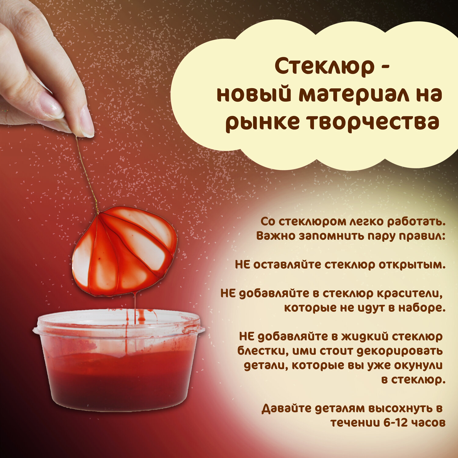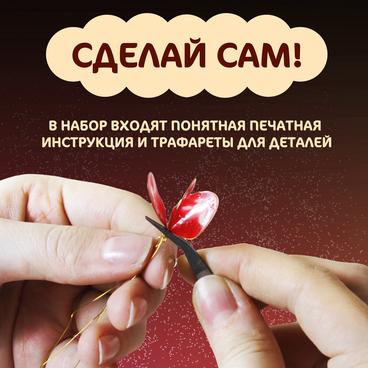 | Комплектация | Состав: 1. Стеклюр 2. Губка 3.Растворитель 4. Проволока 5. Кусачки 6. Пинцет 7. Цепочка 8. Блестки 9. Бусины 10. Инструкция 11. Трафарет |