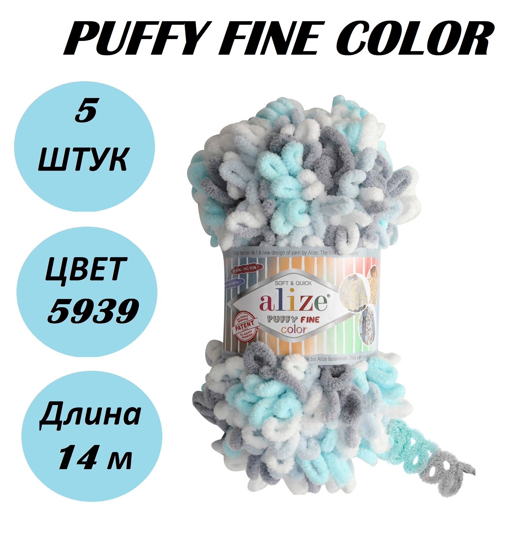 Пряжа Alize Puffy Fine Color (Пуффи Файн Колор) - 5 мотков цвет: 5939 Белый / серый / бирюза 100% микрополиэстер 100г 14м
