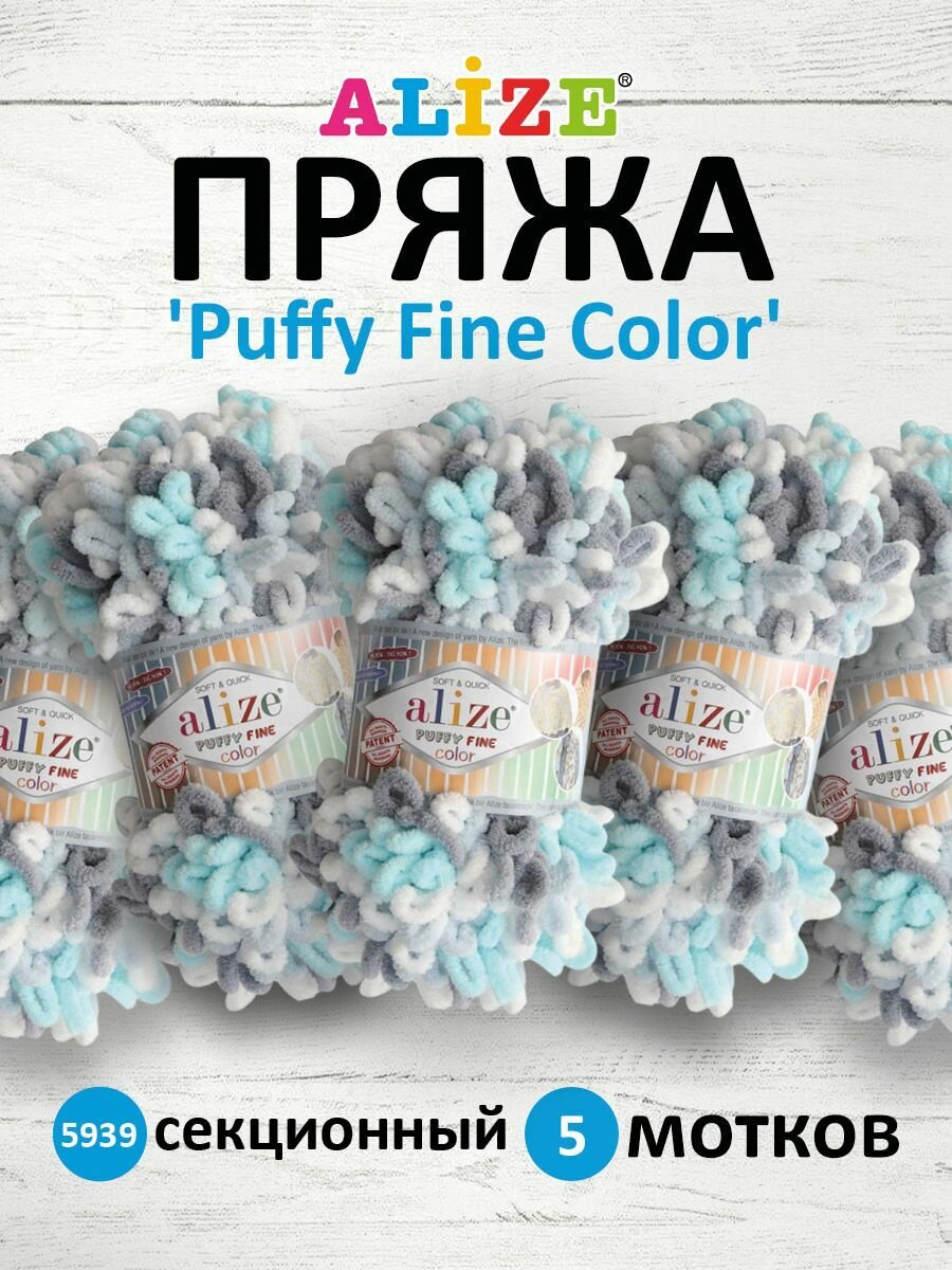 Пряжа PUFFY FINE COLOR (Alize), белый/сер/беж/бирюза - 5946, 100% микрополиэстер, 5 мотков, 100 г, 14 м. 1 441 ₽