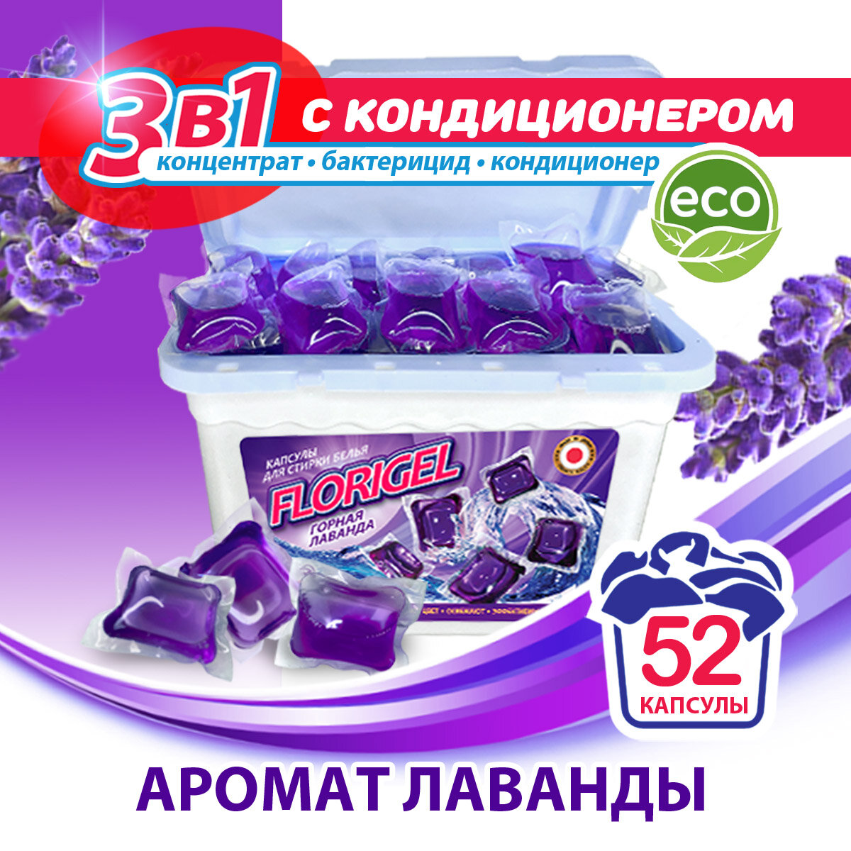 10 цен на Капсулы для стирки Florigel "Горная лаванда", 52 капсулы для стирки, контейнер