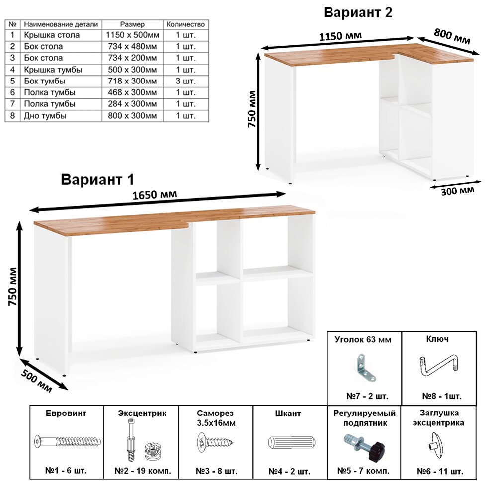 | Дополнительная информация | стол-трансформер с тумбой на четыре полки представляет собой превосходное сочетание стиля и функциональности; с возможностью сборки в трех вариантах — два угловых и один прямой; благодаря встроенной тумбе с четырьмя полками; вы можете выбрать угловую конфигурацию для оптимального использования углов комнаты или прямой вариант для классической расстановки мебели; пластиковые подпятники; поставляется в разобранном виде в упаковке |