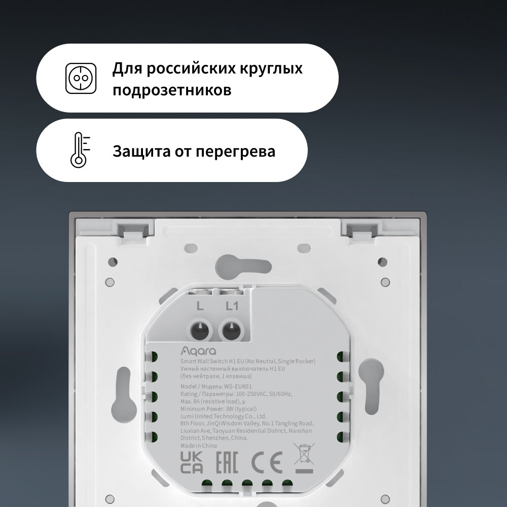 Умный выключатель одноклавишный без нейтрали Aqara H1 WS-EUK01gr, умный дом, серый информация: