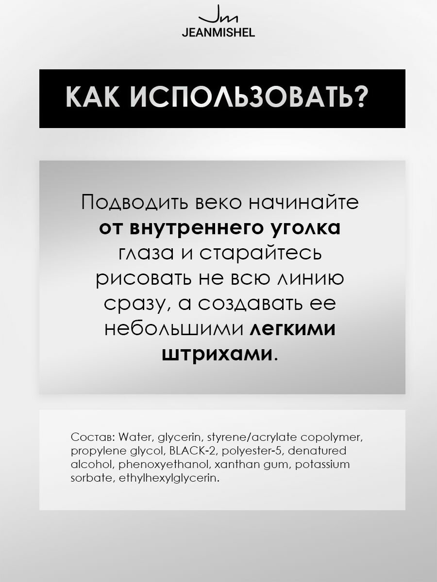 | Способ применения | Встряхнуть подводку. Провести линию вдоль роста ресниц. Плотно закрыть тюбик |
