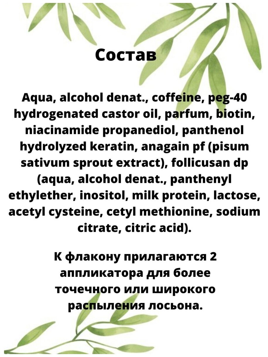 | Состав | Вода, алкоголь денат, кофеин, peg-40 гидрогенизированное касторовое масло, парфюм, биотин, ниацинамид пропандиол, пантенол гидролизованный кератин, анагин pf (экстракт ростка pisum sativum), фолликузан, пантенилэтиловый эфир, инозит, инозит белок, лактоза, ацетилцистеин, цетилметионин, цитрат натрия, лимонная кислота. |
