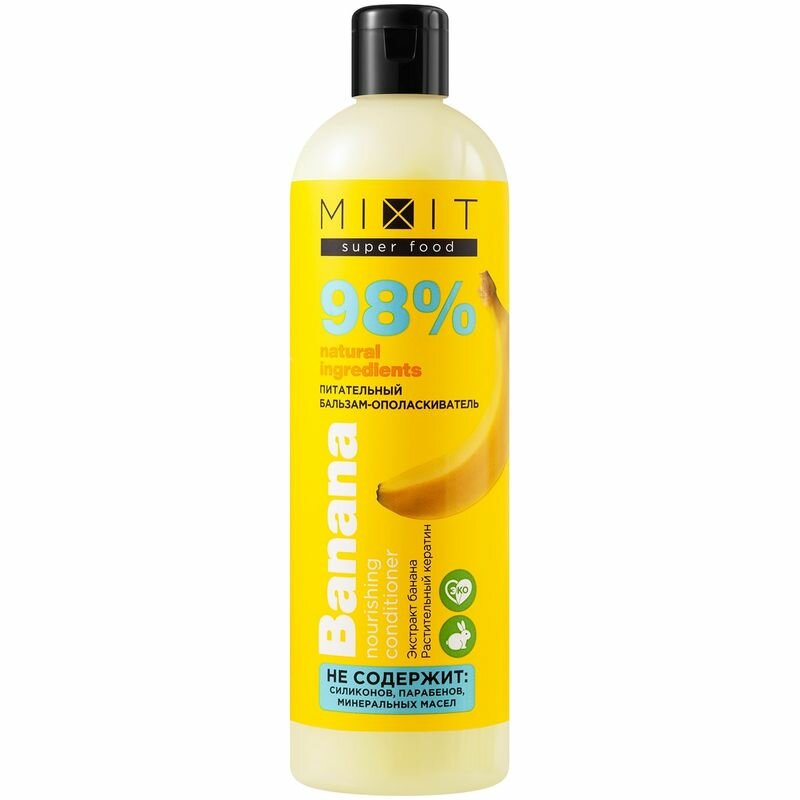 Отзывы на Питательный бальзам ополаскиватель для блеска и сияния волос, увлажняющее и восстанавливающее средство для ухода с кератином, маслом и экстрактом банана SUPER FOOD MixitSF, 400 мл