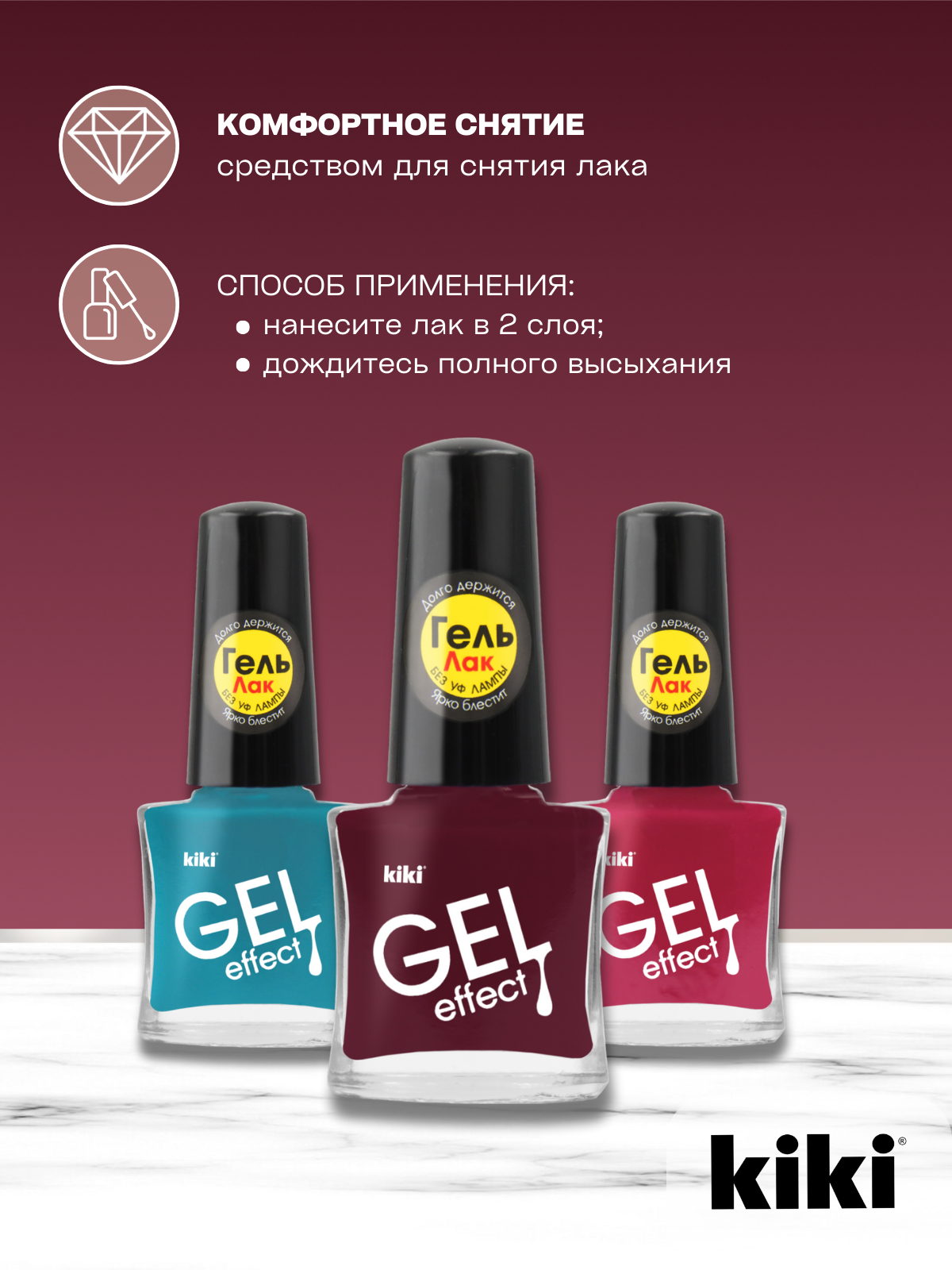 Лак для ногтей kiki Gel Effect тон 19 вишневый с гелевым эффектом без уф-лампы, глянцевый маникюр и педикюр, 6 мл 201 ₽